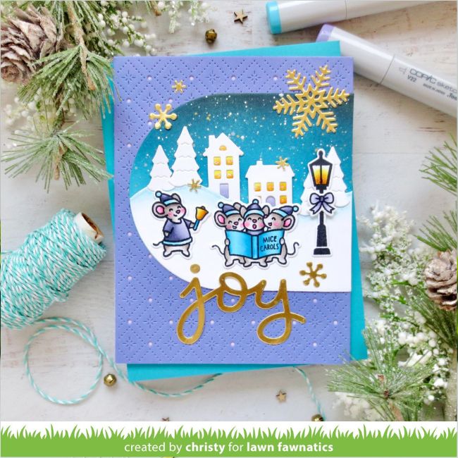 Christy‘s Caroling Mice are bringing joy to all in the Village Hillside Border. Her Winter Wonderland Window and snowflake accents set off the detail in the Quilted Diamond Backdrop. Check out the video tutorial on her YouTube channel!