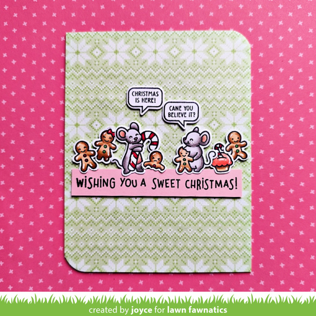 Joyce‘s sweet and simple design pairs our new Sweet Christmas Mice with Tiny Gingerbread on a pretty Knit Picky Winter background!