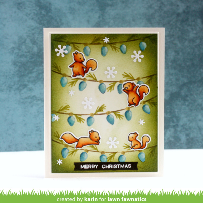 Karin created a beautiful background using our new String of Lights Background Stencils! Then she added the adorable squirrels from Let’s Go Nuts!