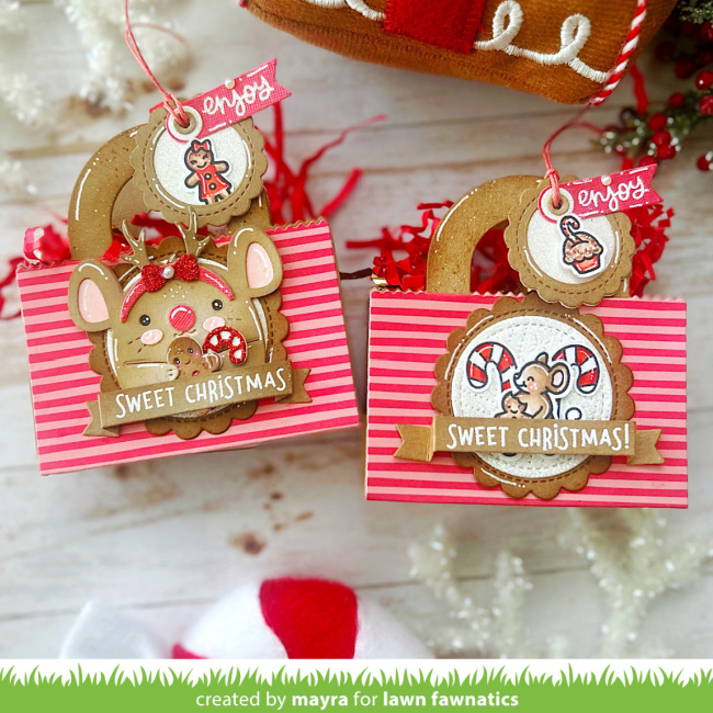 Mayra‘s sweet Tote Bags could not be more fun with a cute mouse theme! She made the totes from All the Sparkles paper and Paper Bag cardstock. Then she decorated them with Sweet Christmas Mice and a die-cut Tiny Gift Box Mouse Add-On and Build-A-Critter Christmas Accessories. She also included Quilted Diamond Backdrop, Tiny Tags, Tiny Gingerbread, and Tiny Tag Sayings.