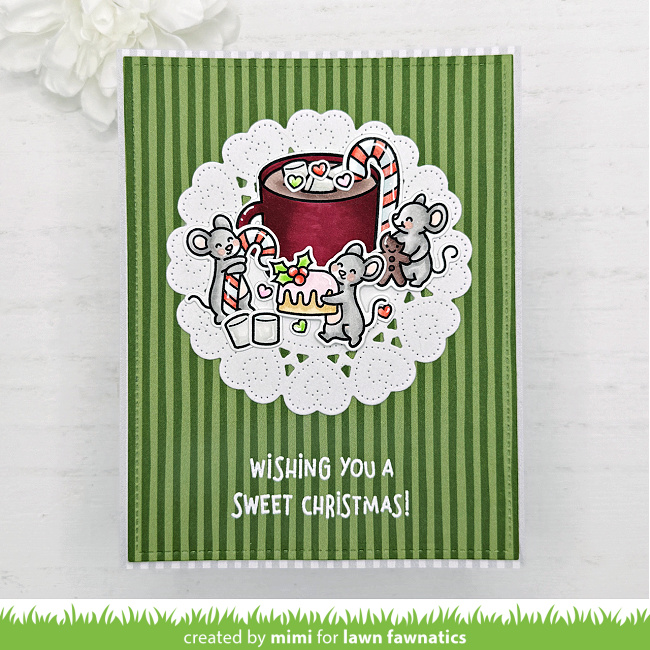 Mimi’s sweet Christmas card features Sweet Christmas Mice and Thanks a Latte! Doily Hearts is the perfect backdrop for this gathering of sweetness!