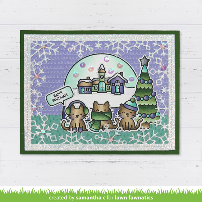 Happy Pawlidays from the cute Cozy Cats! Samantha Casey combined them with older sets Ready Set Snow and Christmas Dreams on a Candy Cane Lane backdrop. Then she framed her design with a sparkly Snow Flurries Backdrop.