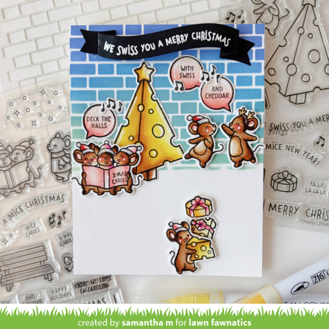 Samantha Mann got all cheesy for her Old + New holiday card! She combined our new Caroling Mice with the Cheesy Christmas set. She also added fun detail using Brick Stencil and a Fancy Wavy Banner sentiment.
