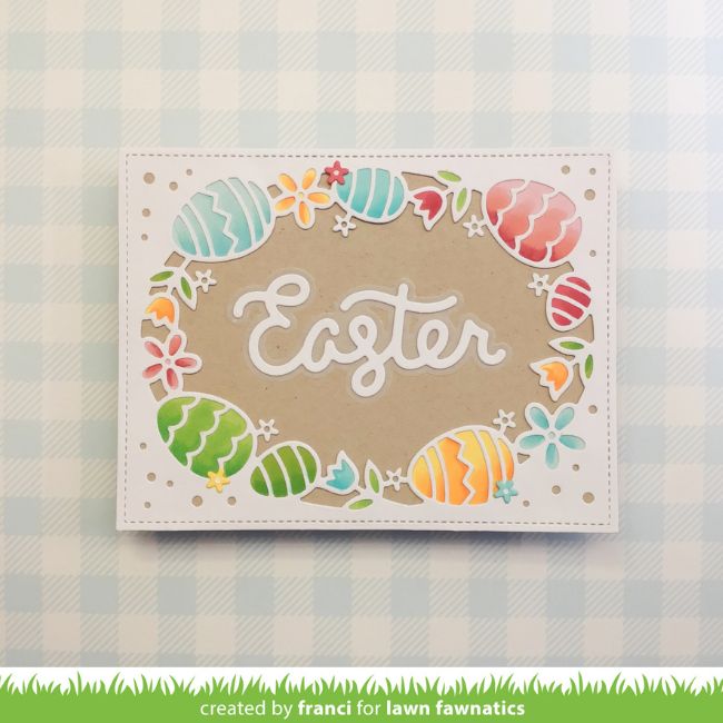 Franci is anticipating the upcoming holiday with her Easter Egg Backdrop card. She added a bold, center sentiment using Scripty Easter and the Scripty Easter Outline Add-on.