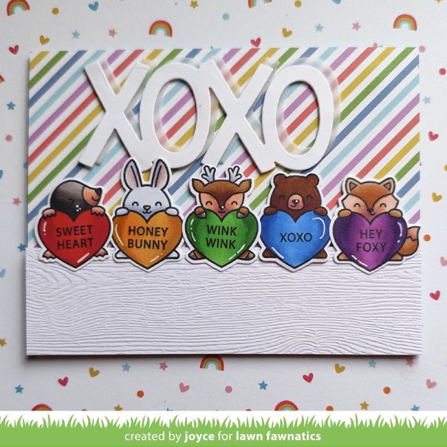 It’s a bright rainbow of puns on Joyce‘s card, featuring the Critter Conversation Hearts and Giant XOXO sentiment. The White Woodgrain Cardstock adds a lovely textural element.