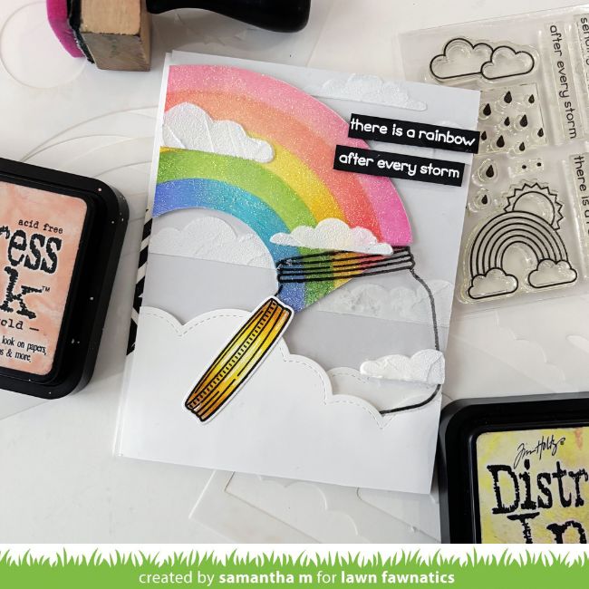 Samantha Mann‘s stunner was stenciled with the Corner Rainbow Stencils and Stratus Cloud Background Stencil. She added a How You Bean? jar stamped on acetate to catch her rainbow and a Puffy Cloud Border to ground her scene.