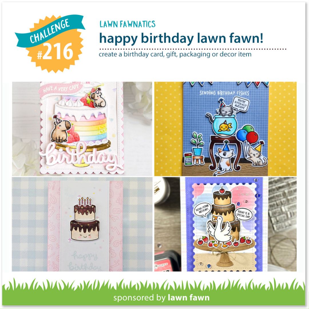 Lawn Fawn is turning Sweet Sixteen! We are thrilled about reaching this milestone, so we’re marking the occasion with a Happy Birthday, Lawn Fawn Challenge! Help us celebrate by creating birthday-themed projects: cards, gifts, party decor, gift packaging, use your imagination!