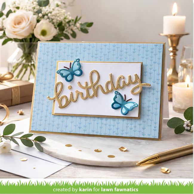 This elegant card has Karin‘s name written all over it! She accented her Scripty Birthday sentiment with butterflies from the Magic Iris Butterfly Wreath Add-on.