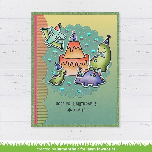 Samantha Casey‘s card features Rawrsome, with the volcano bursting out of the Cake It Easy birthday cake! So clever!