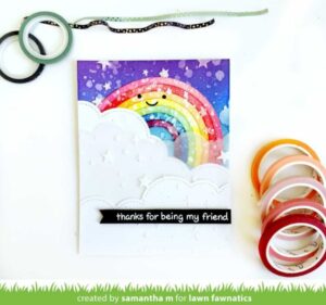 The sweet bears cozying up in one warm scarf are from our Winter Skies set. They look so adorable looking up to the stars in the ink blended and paint splattered sky! To finish the scene Karin added a Stitched Hillside Border and Scripty Love as her greeting!