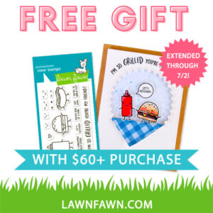 Be sure to check out this fun BBQ Friends stamp set! It’s our Free Gift with orders over $60 exclusively at lawnfawn.com until Friday, June 27th at 11:59 pm (Pacific Time), while supplies last. No coupon code is needed. Happy shopping!