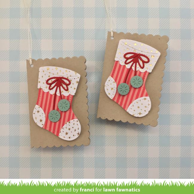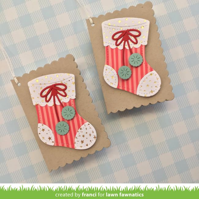 Franci has created a fabulous set of gift tags with the brand-new Christmas Stocking. She’s cleverly used the older Scalloped Rectangle Stackables to make a tag by folding them in half and punching a hole in the top left corner.