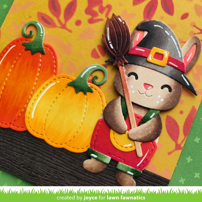 Next, she assembled Build-A-Bunny with Build-A-Bunny Accessories and Build-A-Critter Costumes. She cut all the pieces, including Stitched Pumpkins, from white cardstock before coloring them with Copic markers.