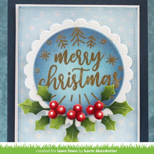 I love the icy blue tones that she introduced with the delicately patterned Bitsy Blooms Petite Paper and her Distress Ink blending. It sets off the traditional reds and greens of the holly berries and leaves from Cute Candy Canes.