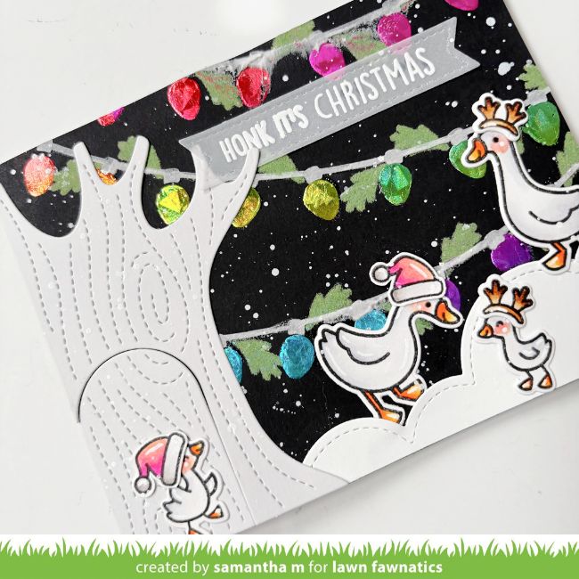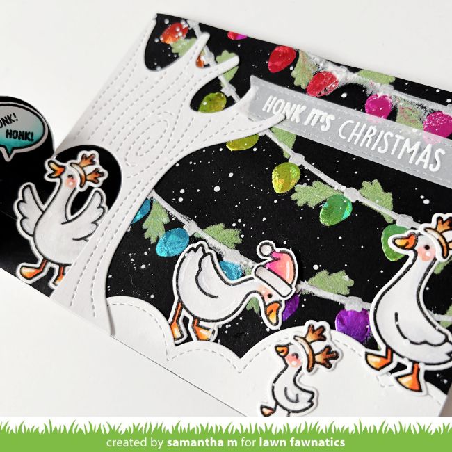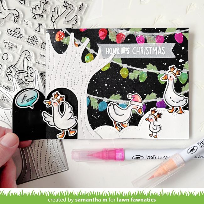It’s Samantha Mann here! I was inspired by the shiny, sparkly rainbow theme and used some fun foil on a black sky to add the fun on my card! So fun! I stamped and colored the images from Silly Goose and Cozy Cats Christmas Add-on with Zig Clean Color Real Brush Markers. Then I added some details with a white gel pen and die cut them out with their coordinating dies.