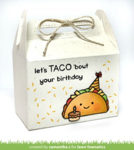 To create the awesome background, Jenn die cut the Stitched Speech Bubble Backdrop from white cardstock then stamped the cute little confetti from Party Animal in rainbow shades of Lawn Fawn inks!