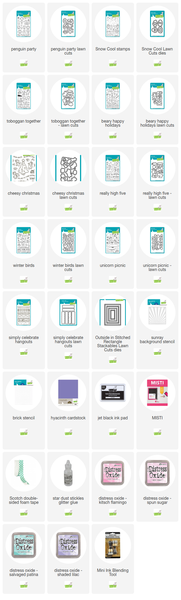 For my focal panel, I cut down a piece of Bristol with the largest Outside In Stitched Rectangle Stackables and blended on Distress Oxide Inks. I used Kitsch Flamingo and Spun Sugar with the Sunray Background Stencil for the light from the disco ball and Salvaged Patina and Shaded Lilac and the Brick Stencil for the walls of the igloo and the ice floor. I also stamped a sentiment across the bottom in black ink. I glued the focal panel to a Hyacinth card base, then adhered my images with a mix of foam tape and liquid glue. And of course, I finished off the card with a lot of Stardust Stickles.