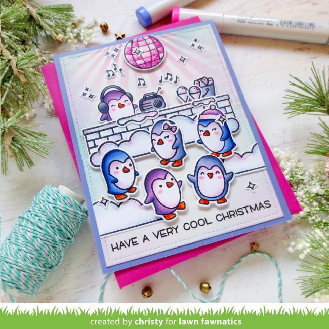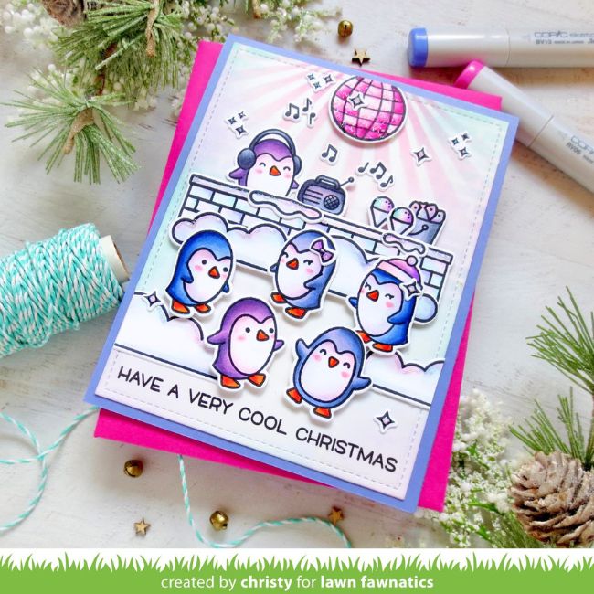 Hey friends, it’s Christy here with another card for our Critters Celebrate the Holidays Challenge! I came up with a bit of a crazy concept for this one, and I pulled together a whole bunch of stamp sets to bring it to life. I wanted to capture a critter celebration that I hadn’t really seen before, and decided on penguins at their disco Christmas party! I used Penguin Party, Snow Cool, Toboggan Together, Beary Happy Holidays, Cheesy Christmas, Really High Five, Winter Birds, Unicorn Picnic, and Simply Celebrate Hangouts. Whew! I colored all the images with Copic markers and trimmed them out with the matching dies.
