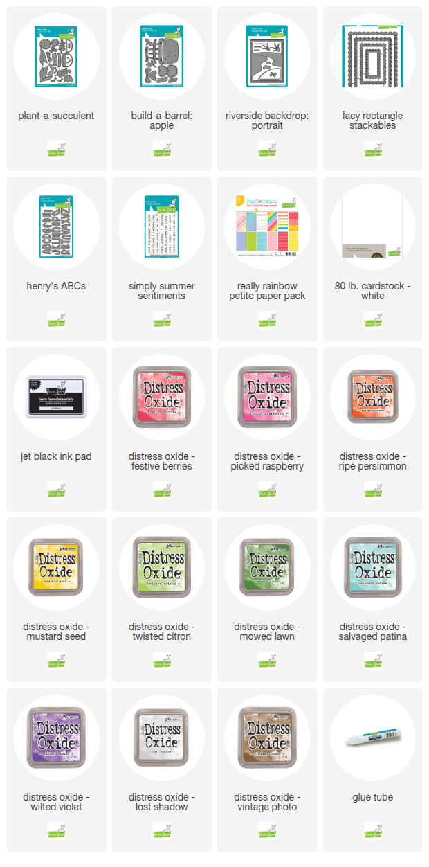 Her beautiful botanical arrangement features Plant-A-Succulent rooted inside the Build-A-Barrel: Apple. For color, she used a rainbow of Distress Oxide Inks!