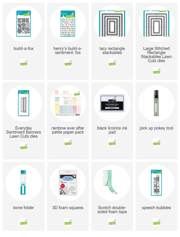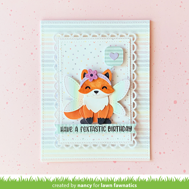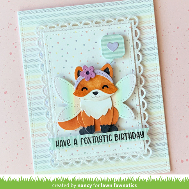 I stamped the fun “foxtastic” birthday greeting from Henry’s Build-A-Sentiment: Fox on a Rainbow Ever After Everyday Sentiment Banner. I used Copic markers to color all the die cut pieces before assembling the fox and adding her to the card. The little speech bubble and heart are from the Speech Bubbles Lawn Cuts set that is retiring soon but any speech bubble die and tiny heart will fill the space nicely.