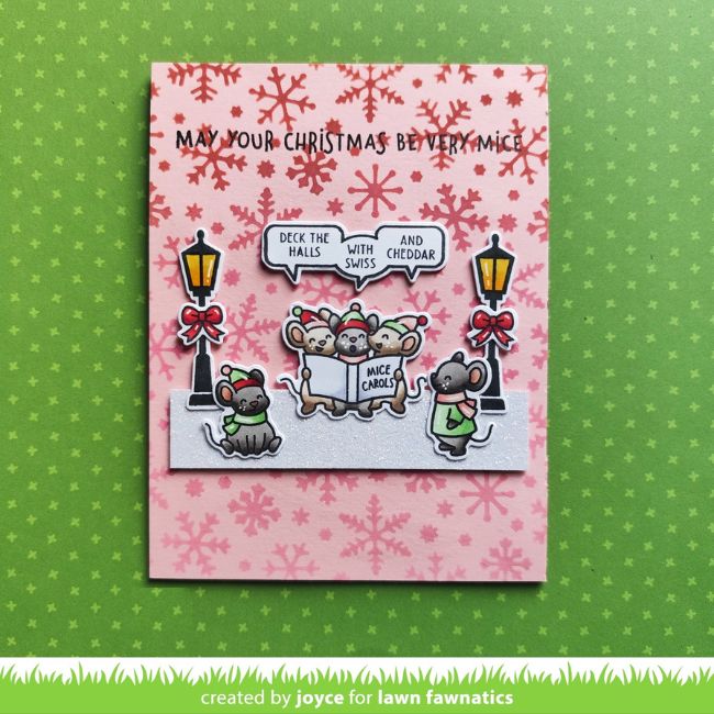 Joyce‘s card packs a punch with swirling snow, thanks to the beautiful ombre ink blending using the Snowflakes Stencil. It makes the perfect backdrop to her Caroling Mice.