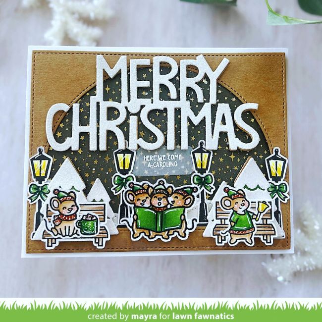 Mayra is bringing the glitz and glamour with her gorgeous gold foiled All the Sparkles patterned paper backdrop and Pixie Dust Sparkle Cardstock covered trees. They make those adorable Caroling Mice seem right at home.