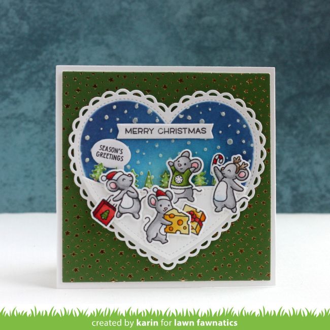 Karin‘s square card is full of heart and Christmas spirit! The Cheesy Christmas mice are celebrating the snowfall inside a Lacy Heart Stackables, with the Forest Border in the background.