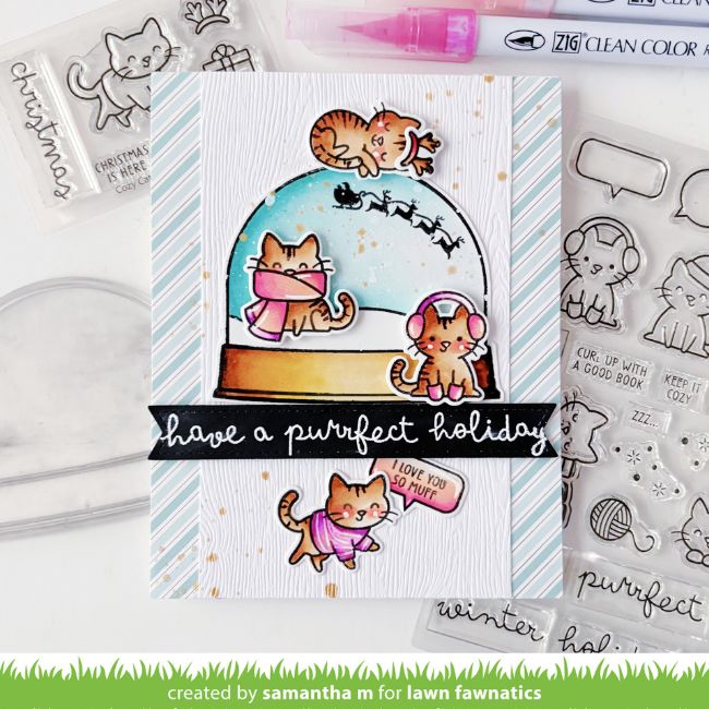 Samantha Mann‘s Cozy Cats are enjoying the purrfect holiday perched in and around the snowglobe from Ready, Set, Snow. These kitties must have been good this year. It looks like Santa is on his way!