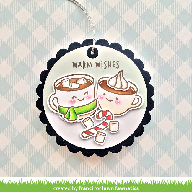 Franci created a sweet gift tag with Thanks a Latte! Make a bunch of these yummy hot beverage tags to have on hand for cold weather gifts. The tag is simply a Circle Stackable, layered on a Scalloped Circle Stackable.